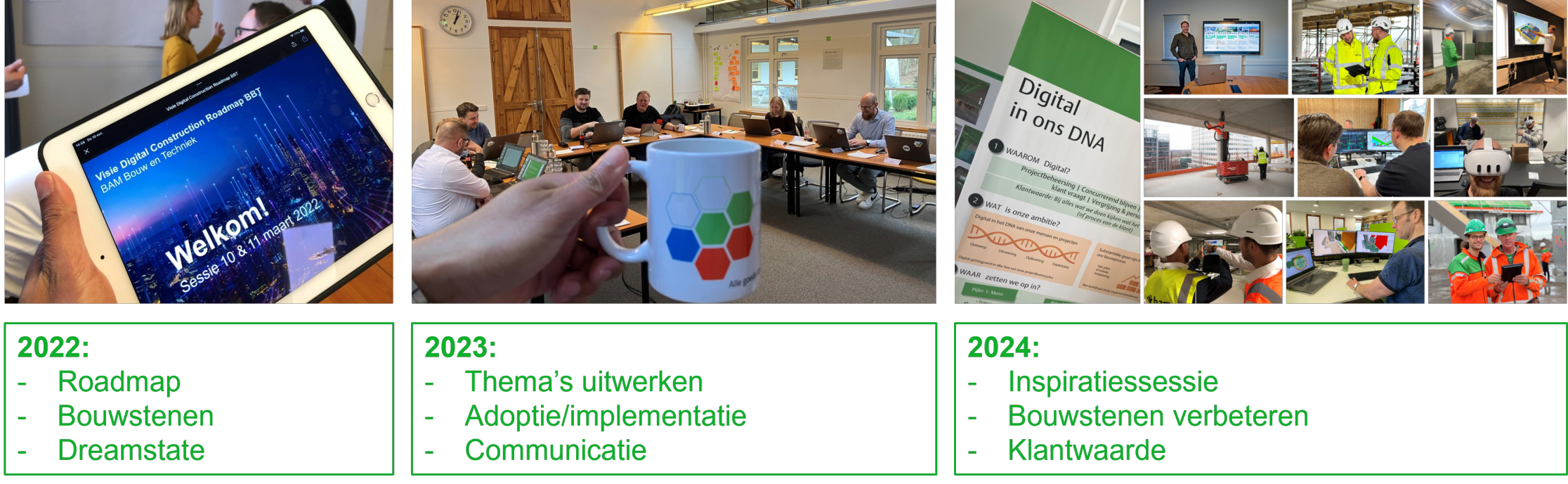 Er gebeurt heel veel op het gebied van DCI (Digital Construction Implementatie) en digitalisering in het algemeen bij BAM. Inmiddels zijn wij toe aan de 4e sessie! We zijn de sessie daarom gestart met een korte terugblik van de voorgaande jaren. In 2022 was onze start van de inmiddels bekende Digitale Bouwstenen. In 2023 lag de focus meer op adoptie & implementatie (onderwerpen zoals communicatie en mens & organisatie kwamen veelvuldig aan bod). En in 2024 (verslag BAM Bouw en Techniek Digital bijeenkomst) hebben wij ons gericht op verdere uitwerking en verbeteren van onze Bouwstenen en bij alles de klantwaarde te definiëren.