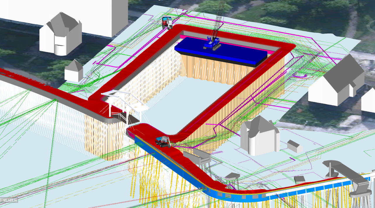 Binnen dit project is BIM ingezet als verbindend platform voor alle betrokken disciplines. De nieuwe kademuren zijn volledig uitgewerkt in één integraal model, waarin ook de bestaande situatie is opgenomen. Kabels, leidingen en overige ondergrondse objecten zijn expliciet gemodelleerd, waardoor raakvlakken en potentiële conflicten vroegtijdig zichtbaar werden. Met name rond de aansluiting van de kademuur op de ondergrondse infrastructuur leverde dit waardevolle inzichten op.