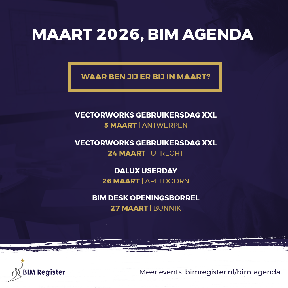 De volledige BIM Agenda van maart 2026 is te vinden via bimregister.nl/bim-agenda. Bekijk het overzicht, plan uw deelname en haal het maximale uit wat de BIM-sector deze maand te bieden heeft.