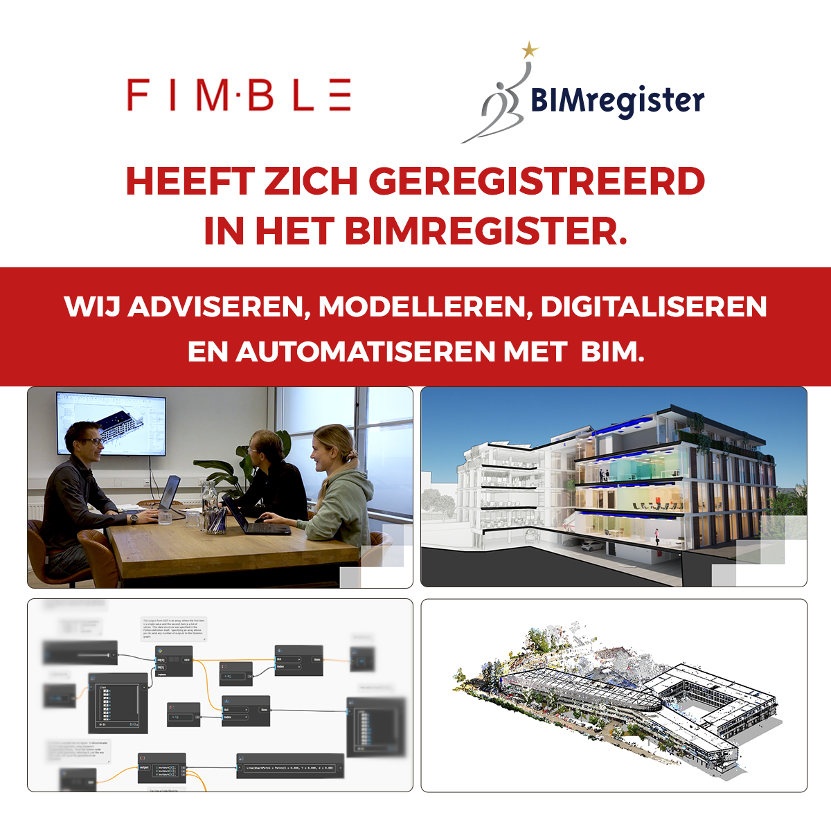 Fimble is een BIM advies- en modelleerbureau. Het doel is: betrouwbare en gevalideerde gebouwinformatie waar je op kunt bouwen. Je kunt bij FIMBLE terecht voor modelleerondersteuning bij het technisch uitwerken van een ontwerp, bij de werkvoorbereiding en bij het uitwerken van bestaand vastgoed. Zij helpen organisaties ook met de toepassing van BIM. Hun advies leidt tot concrete inzet van BIM in de organisatie. Dit zijn trajecten voor de totstandkoming van een ILS en BIM protocol maar ook advies over technische modelleermogelijkheden.