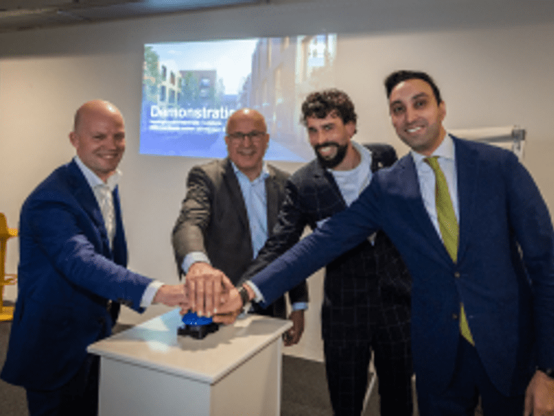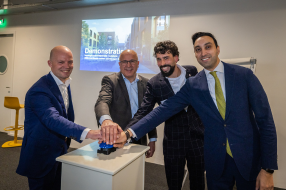 Michiel de Vries (COO VORM), Mohamed el Achkar (bestuursvoorzitter Woonstad Rotterdam), Pim van Meer (directeur Digitalisering VORM) en Fahid Minhas (directeur NEPROM).