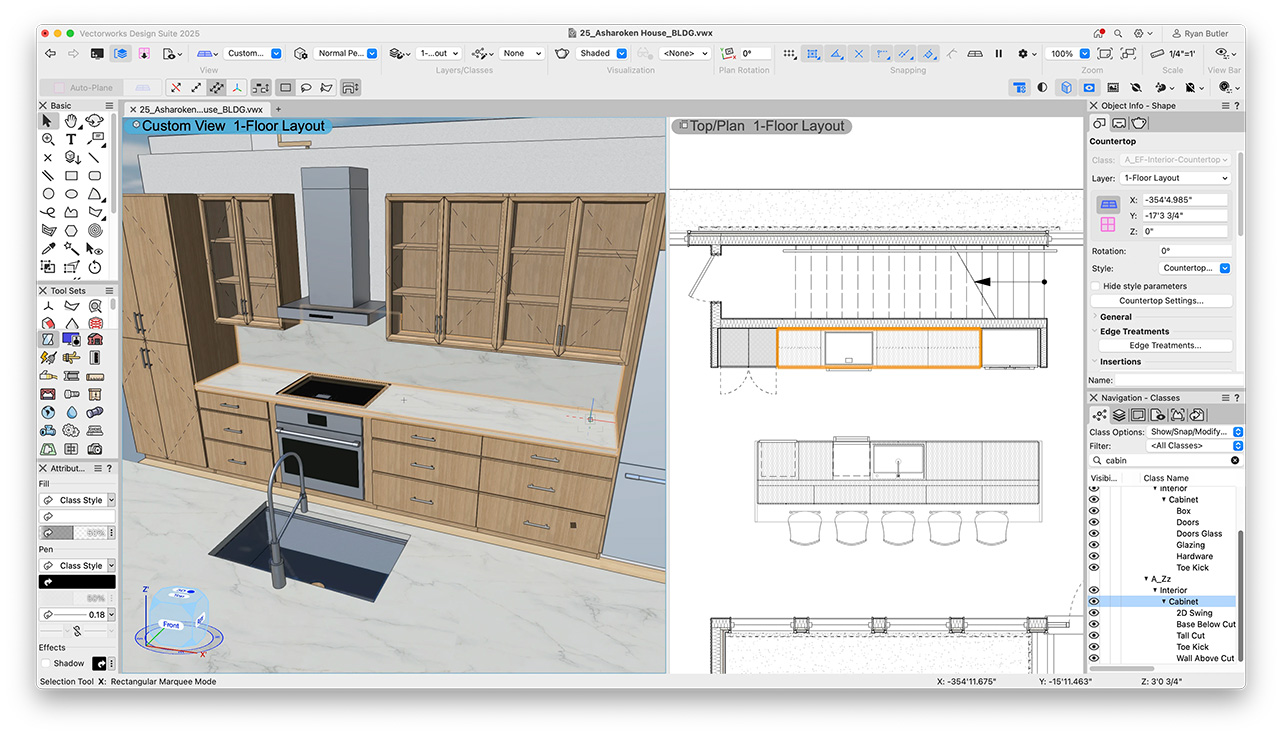 De ontwerpomgeving van Vectorworks Architectuur is volledig geïntegreerd, waardoor je gelijktijdig in 2D en 3D kan werken zonder tussen verschillende programma’s te schakelen. Of je nu een eerste idee schetst, een complexe vorm modelleert of bouwplannen samenstelt, alles gebeurt in één ruimte.