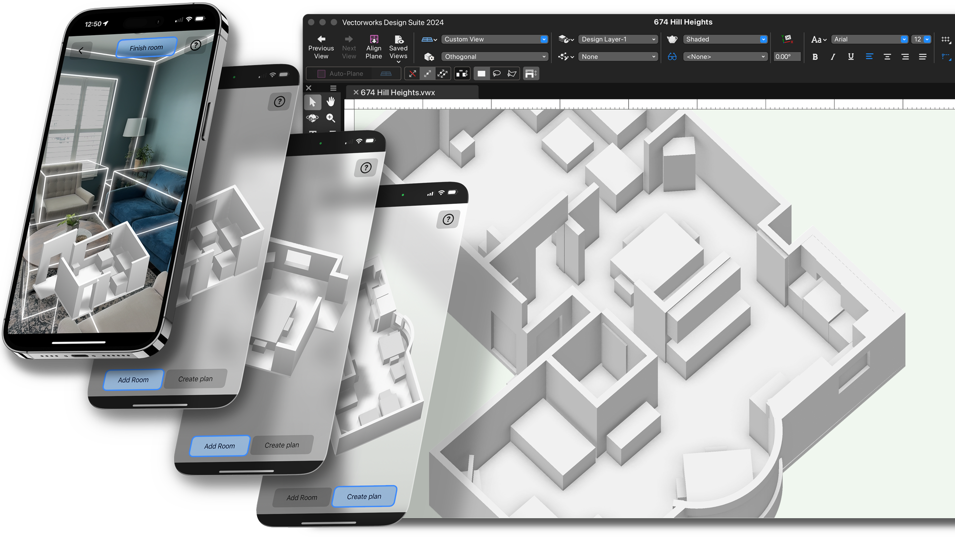 Vectorworks Architectuur komt met de gratis te gebruiken Vectorworks Nomad app, waarmee je de bestaande toestand van een site kan scannen. De app is beschikbaar voor zowel Android- als iOS-apparaten. Eén van de vele functies is Fotogrammetrie, waarmee je foto’s omzet naar 3D-modellen. Zo creëer je zonder veel moeite gedetailleerde 3D-modellen.